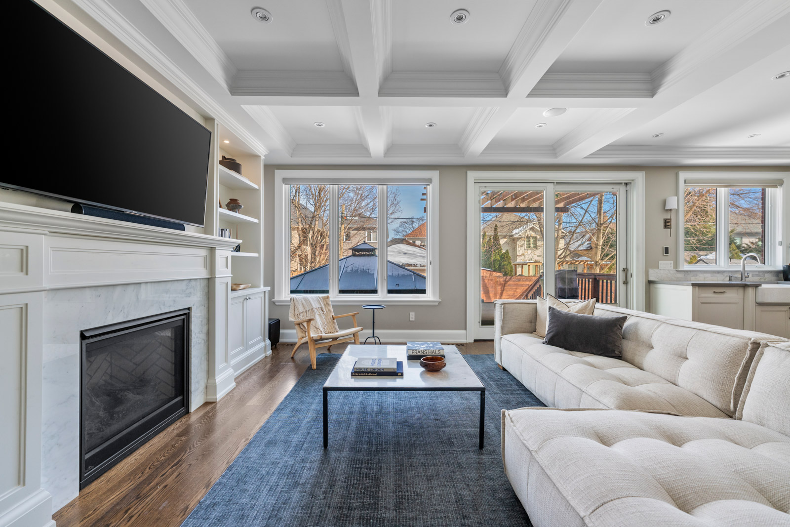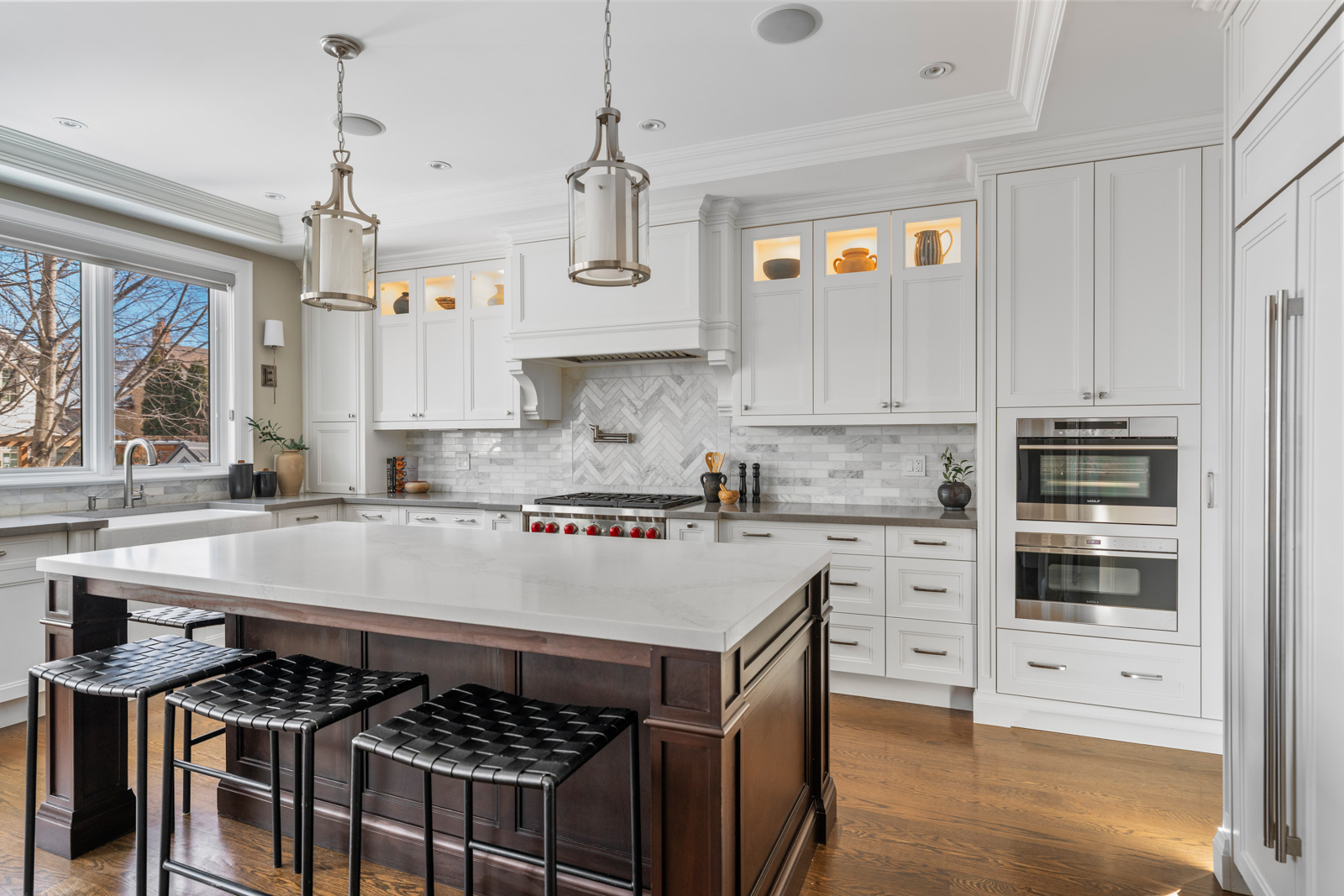 The main floor features a private office, formal dining room, and a mudroom with a convenient wash station. The open-concept chef's kitchen is outfitted with Wolf and Sub-Zero appliances, a large cast-iron sink, centre island, hardwood floors, and pot lights - perfectly designed for entertaining.