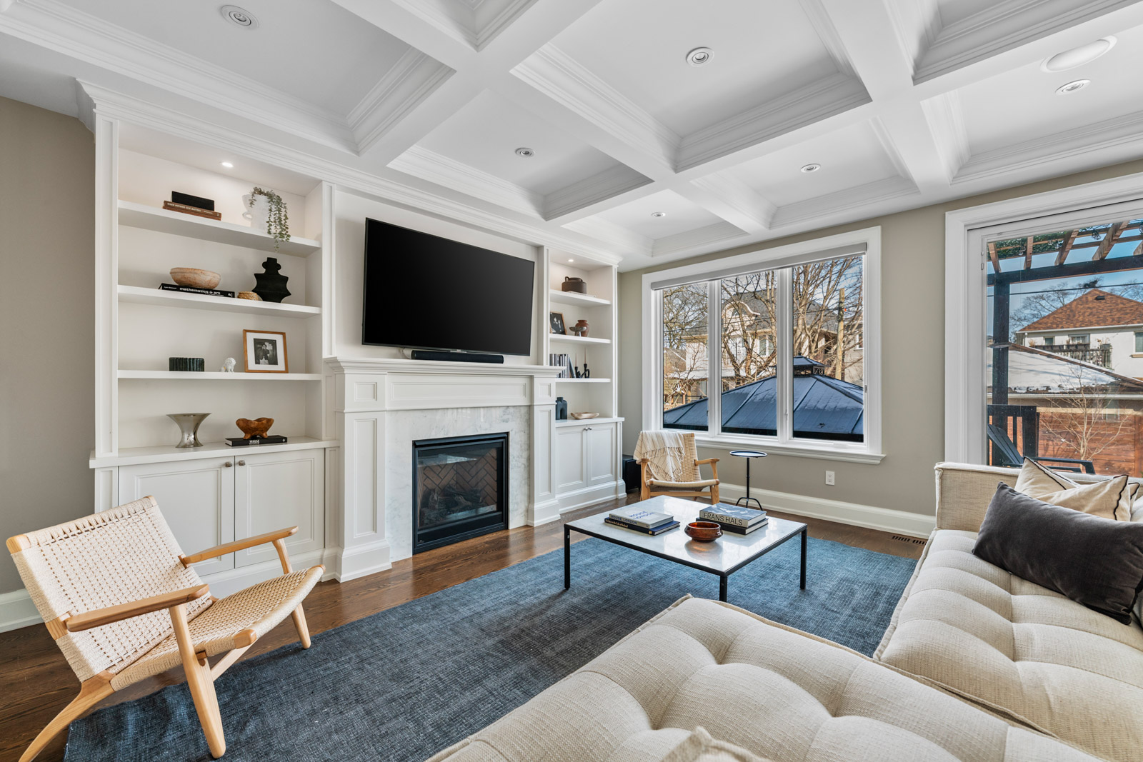 The living room impresses with a coffered ceiling, gas fireplace with built-ins, and an integrated speaker system. Upstairs, four spacious bedrooms with ensuite access, complemented by a convenient second-floor laundry room. Three retractable skylights with rain sensors flood the upper level with natural light, creating a bright and airy atmosphere throughout.